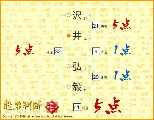 沢(17画)井(4画) 弘(5画)毅(15画)