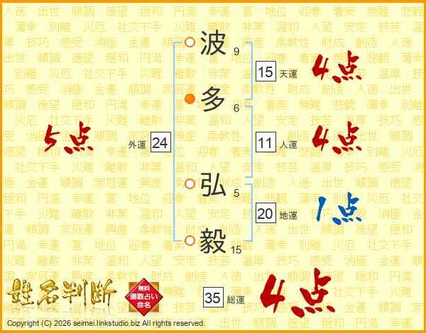 生活面を象徴する運勢です。外部から受ける影響力を表し、結婚運、家庭運や職場、環境への順応性を表します。総運から人運を引いた画数。姓や名が1文字の場合を除く。