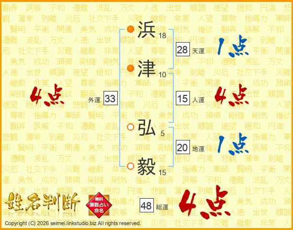 浜(18画)津(10画) 弘(5画)毅(15画)