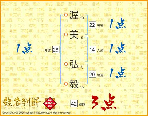 渥(13画)美(9画) 弘(5画)毅(15画)