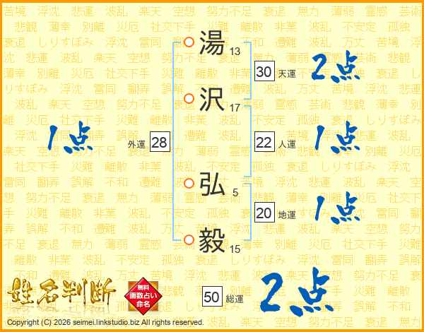 湯(13画)沢(17画) 弘(5画)毅(15画)