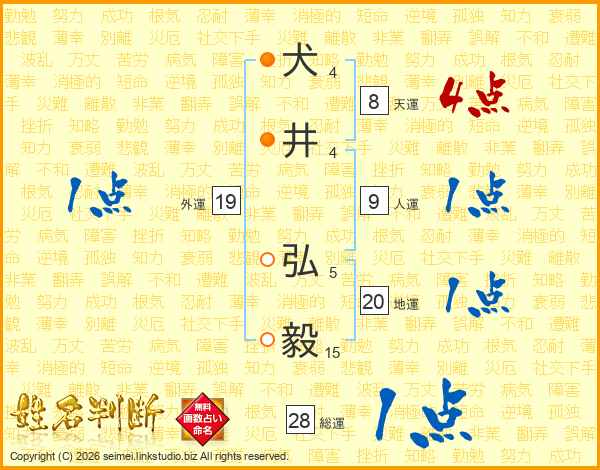 犬(4画)井(4画) 弘(5画)毅(15画)