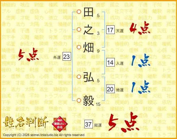 田(5画)之(3画)畑(9画) 弘(5画)毅(15画)