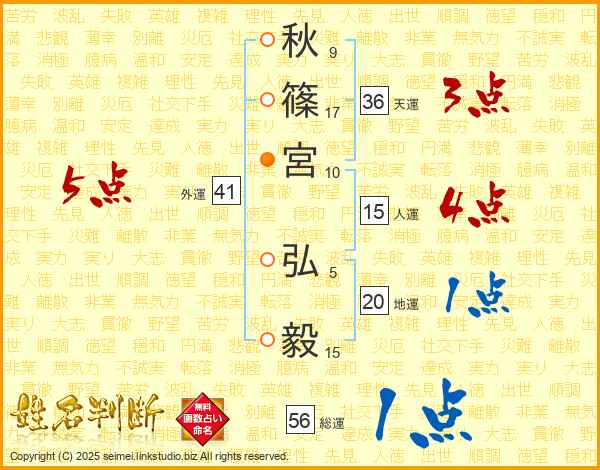 秋(9画)篠(17画)宮(10画) 弘(5画)毅(15画)