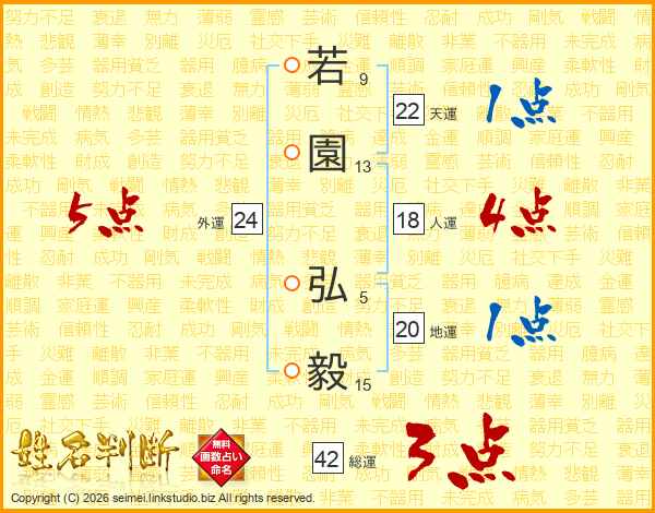 若(9画)園(13画) 弘(5画)毅(15画)