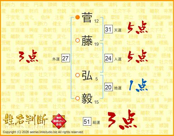 菅(12画)藤(19画) 弘(5画)毅(15画)