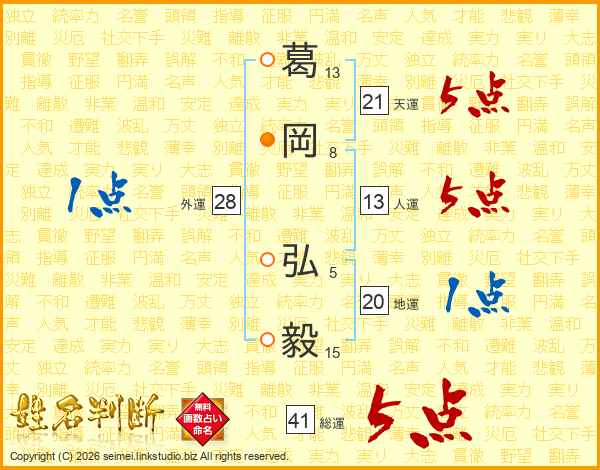 葛(13画)岡(8画) 弘(5画)毅(15画)
