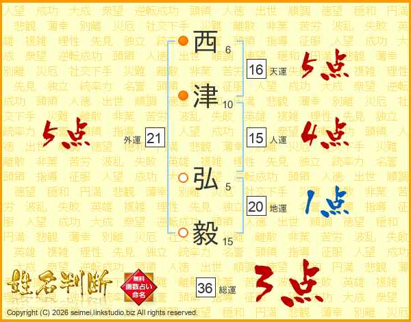 西津弘毅さんの総運は36画の3点!