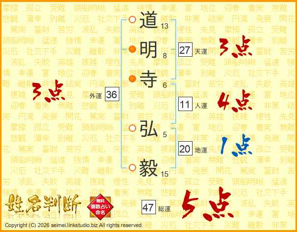 道(13画)明(8画)寺(6画) 弘(5画)毅(15画)