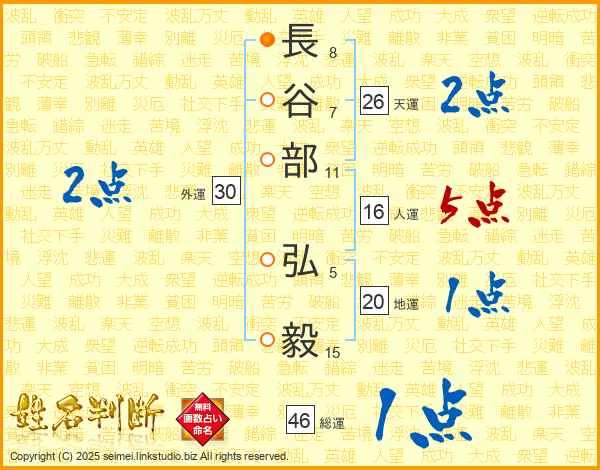 長(8画)谷(7画)部(11画) 弘(5画)毅(15画)