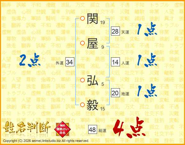 関屋弘毅さんの総運は48画の4点!
