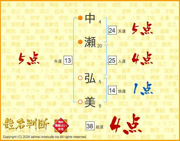 中(4画)瀬(20画) 弘(5画)美(9画)
