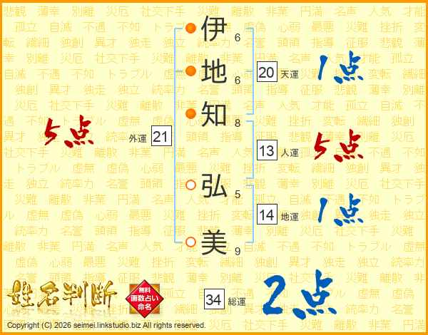 伊(6画)地(6画)知(8画) 弘(5画)美(9画)