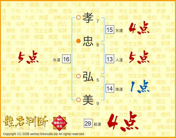 孝忠弘美さんの外運は16画の5点!