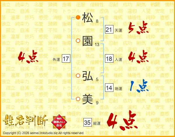 松(8画)園(13画) 弘(5画)美(9画)
