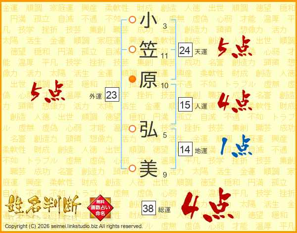 小(3画)笠(11画)原(10画) 弘(5画)美(9画)