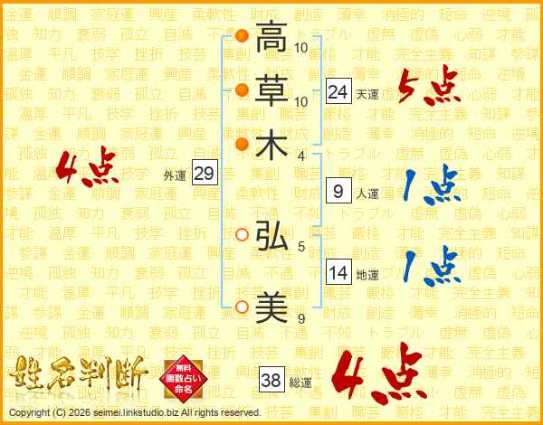 高(10画)草(10画)木(4画) 弘(5画)美(9画)