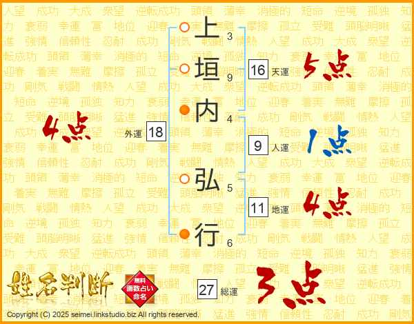 上(3画)垣(9画)内(4画) 弘(5画)行(6画)