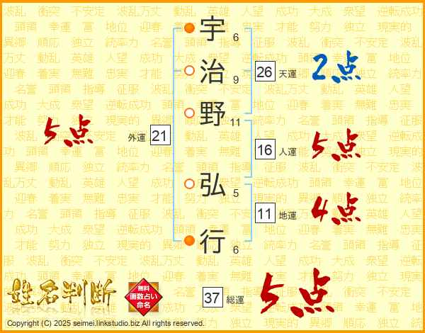 宇(6画)治(9画)野(11画) 弘(5画)行(6画)