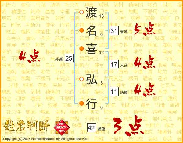 渡(13画)名(6画)喜(12画) 弘(5画)行(6画)