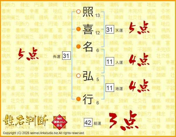 照(13画)喜(12画)名(6画) 弘(5画)行(6画)