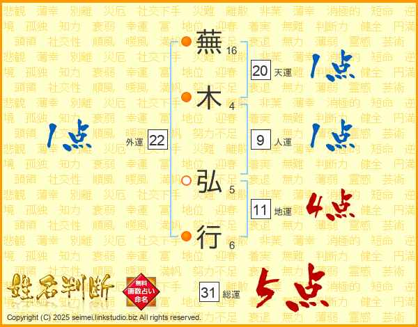 蕪(16画)木(4画) 弘(5画)行(6画)