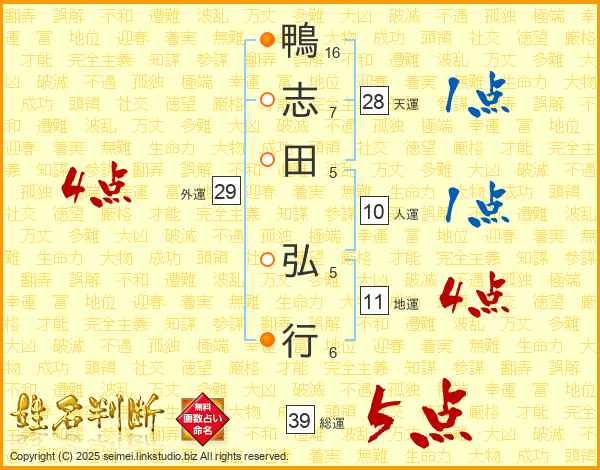 鴨(16画)志(7画)田(5画) 弘(5画)行(6画)