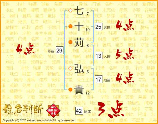 七(7画)十(10画)苅(8画) 弘(5画)貴(12画)