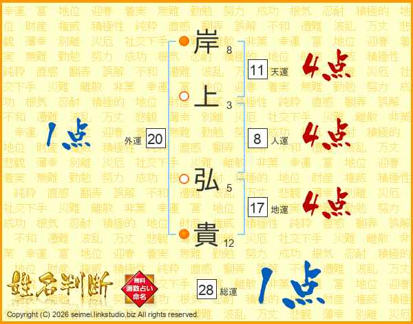 岸(8画)上(3画) 弘(5画)貴(12画)