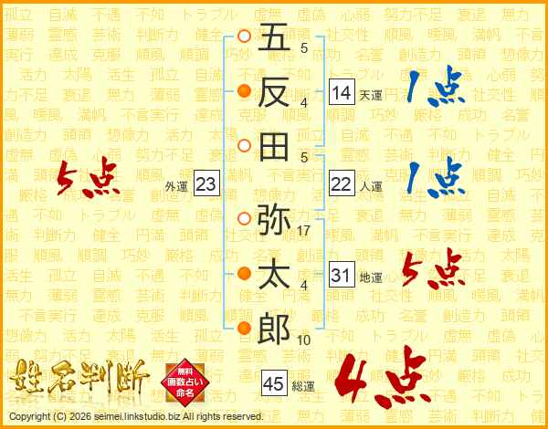五(5画)反(4画)田(5画) 弥(17画)太(4画)郎(10画)