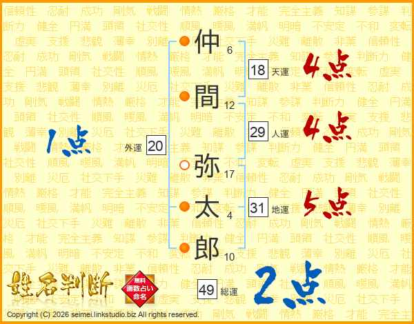 仲(6画)間(12画) 弥(17画)太(4画)郎(10画)