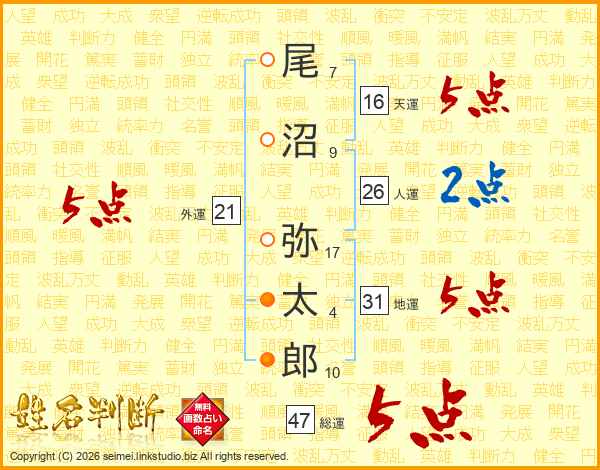 尾(7画)沼(9画) 弥(17画)太(4画)郎(10画)