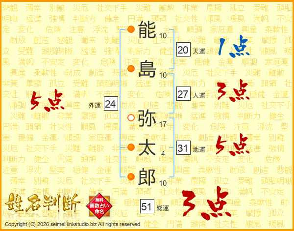 能(10画)島(10画) 弥(17画)太(4画)郎(10画)