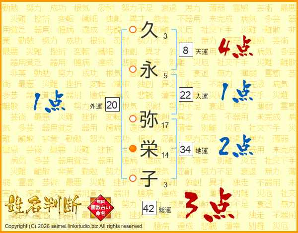 久(3画)永(5画) 弥(17画)栄(14画)子(3画)