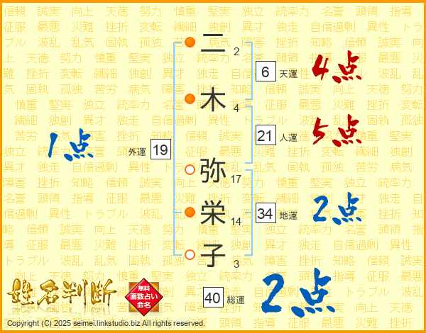 二(2画)木(4画) 弥(17画)栄(14画)子(3画)