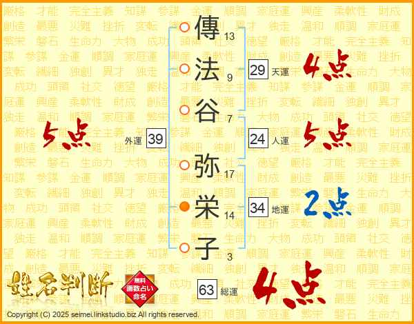 傳(13画)法(9画)谷(7画) 弥(17画)栄(14画)子(3画)
