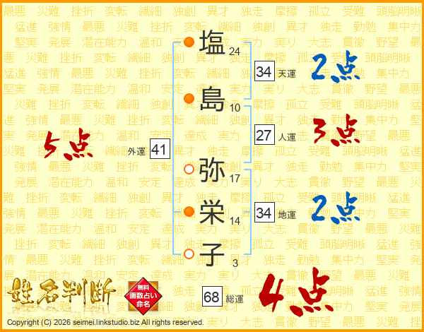 塩(24画)島(10画) 弥(17画)栄(14画)子(3画)