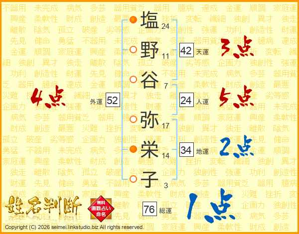 塩野谷弥栄子さんの外運は52画の4点!