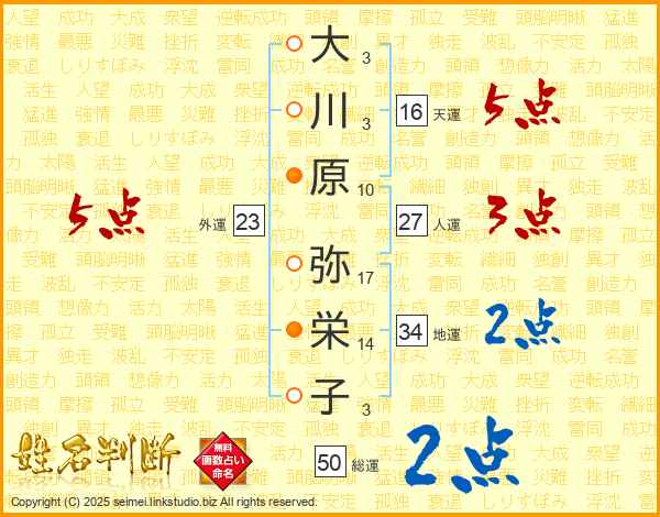 大(3画)川(3画)原(10画) 弥(17画)栄(14画)子(3画)