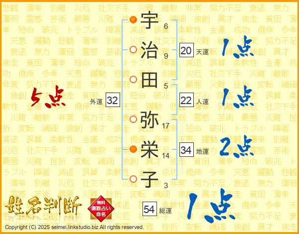 宇(6画)治(9画)田(5画) 弥(17画)栄(14画)子(3画)