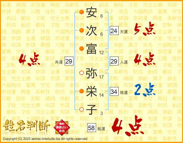 安(6画)次(6画)富(12画) 弥(17画)栄(14画)子(3画)