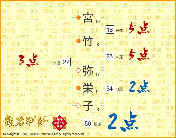 宮(10画)竹(6画) 弥(17画)栄(14画)子(3画)