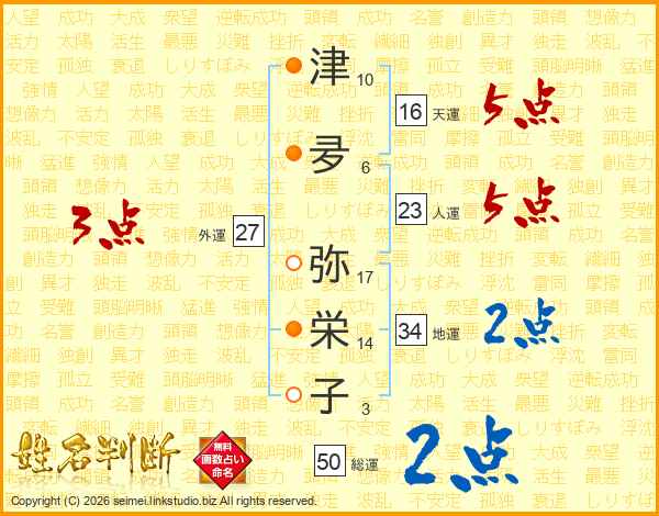 津(10画)夛(6画) 弥(17画)栄(14画)子(3画)