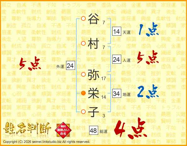 谷(7画)村(7画) 弥(17画)栄(14画)子(3画)