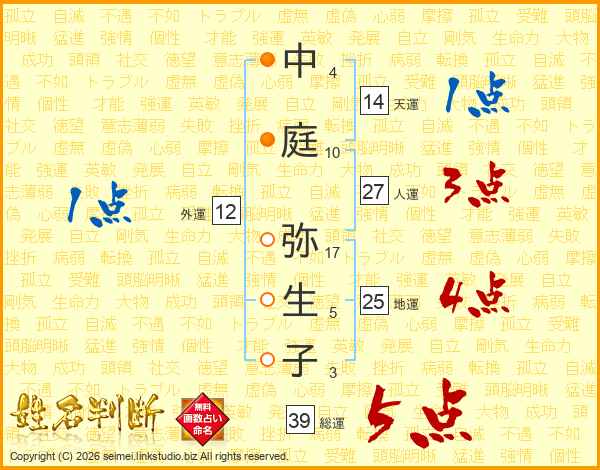 中(4画)庭(10画) 弥(17画)生(5画)子(3画)