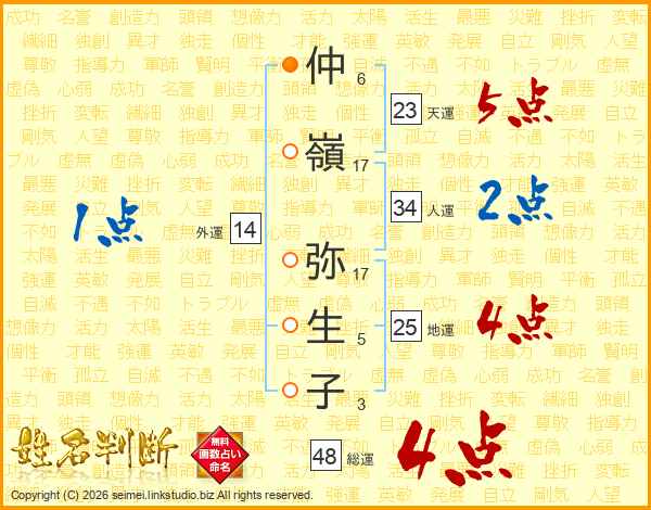 仲(6画)嶺(17画) 弥(17画)生(5画)子(3画)