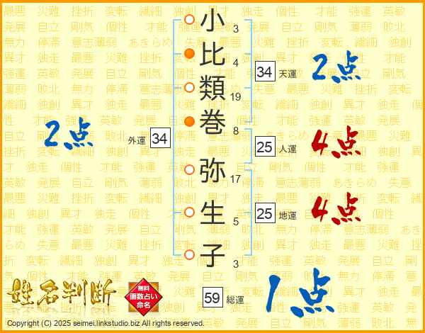 小(3画)比(4画)類(19画)巻(8画) 弥(17画)生(5画)子(3画)