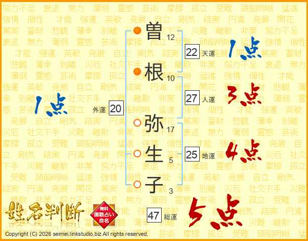曽根弥生子さんの総運は47画の5点!