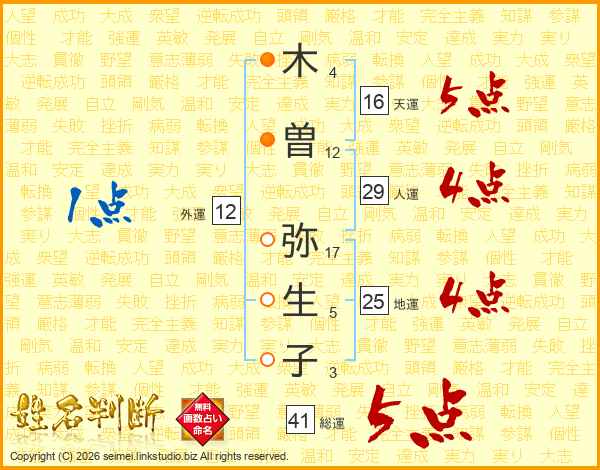 木(4画)曽(12画) 弥(17画)生(5画)子(3画)