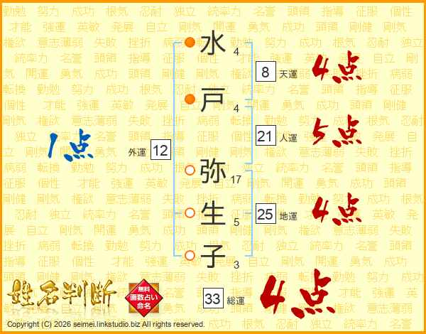 水戸弥生子さんの総運は33画の4点!